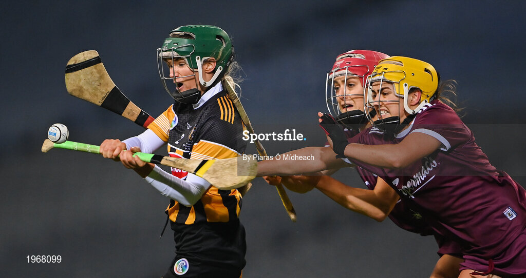 12 December 2020; Michelle Teehan of Kilkenny in action against Orlaith McGrath, and Siobhán McGrath, right, of Galway during the Liberty Insurance All-Ireland Senior Camogie Championship Final match between Galway and Kilkenny at Croke Park in Dublin. Photo by Piaras Ó Mídheach/Sportsfile