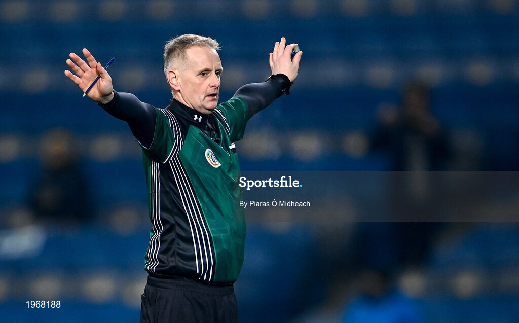 12 December 2020; Referee Owen Elliot signals to a award a penalty, which Denise Gaule of Kilkenny scored a goal from, late in the second half of during the Liberty Insurance All-Ireland Senior Camogie Championship Final match between Galway and Kilkenny at Croke Park in Dublin. Photo by Piaras Ó Mídheach/Sportsfile