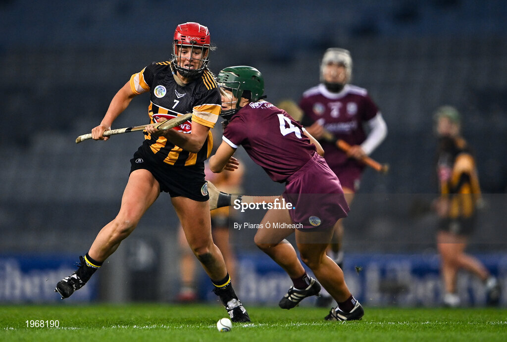 12 December 2020; Grace Walsh of Kilkenny in action against Heather Cooney of Galway during the Liberty Insurance All-Ireland Senior Camogie Championship Final match between Galway and Kilkenny at Croke Park in Dublin. Photo by Piaras Ó Mídheach/Sportsfile