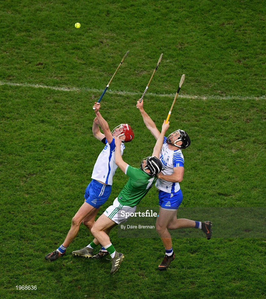 13 December 2020; Calum Lyons, left, and Ian Kenny of Waterford in action against Graeme Mulcahy of Limerick during the GAA Hurling All-Ireland Senior Championship Final match between Limerick and Waterford at Croke Park in Dublin. Photo by Daire Brennan/Sportsfile