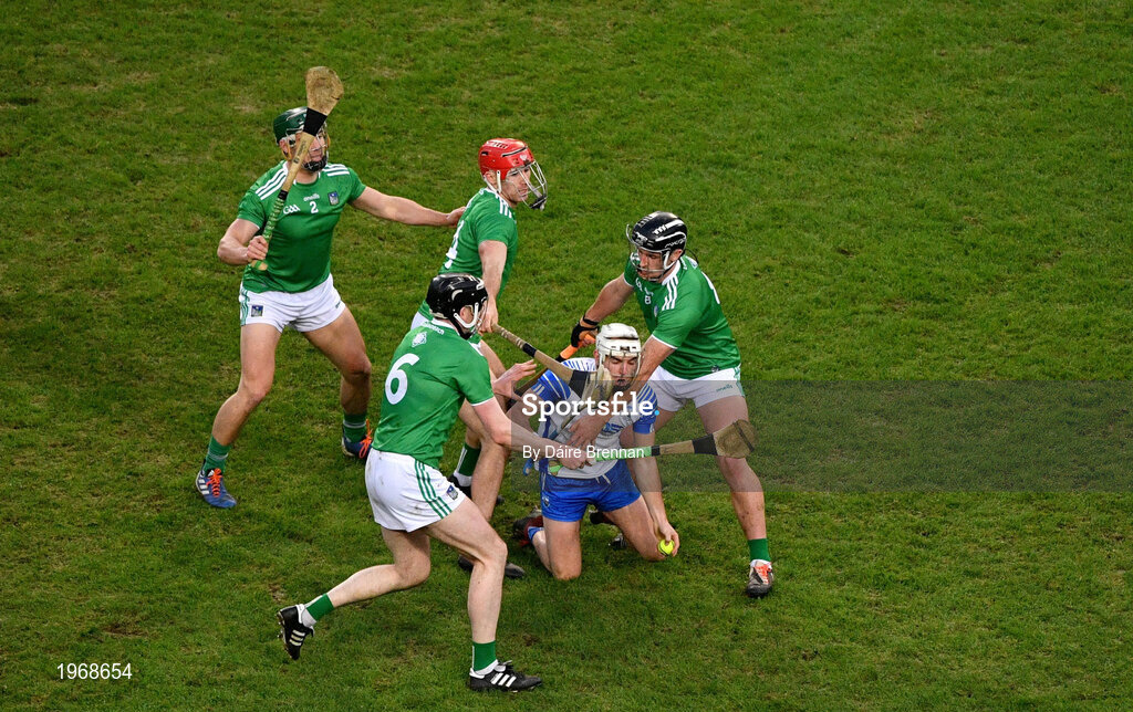 13 December 2020; Dessie Hutchinson of Waterford in action against Limerick players, left to right, Seán Finn, Declan Hannon, Barry Nash, and Darragh O'Donovan during the GAA Hurling All-Ireland Senior Championship Final match between Limerick and Waterford at Croke Park in Dublin. Photo by Daire Brennan/Sportsfile