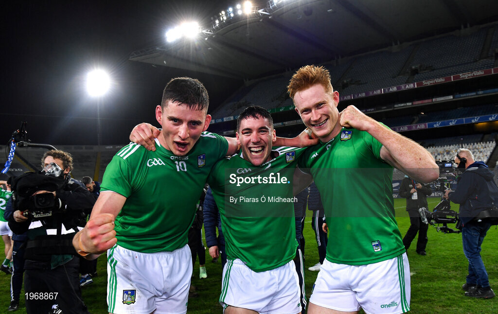 13 December 2020; Limerick players, from left, Gearóid Hegarty, Seán Finn, and William O'Donoghue celebrate after the GAA Hurling All-Ireland Senior Championship Final match between Limerick and Waterford at Croke Park in Dublin. Photo by Piaras Ó Mídheach/Sportsfile