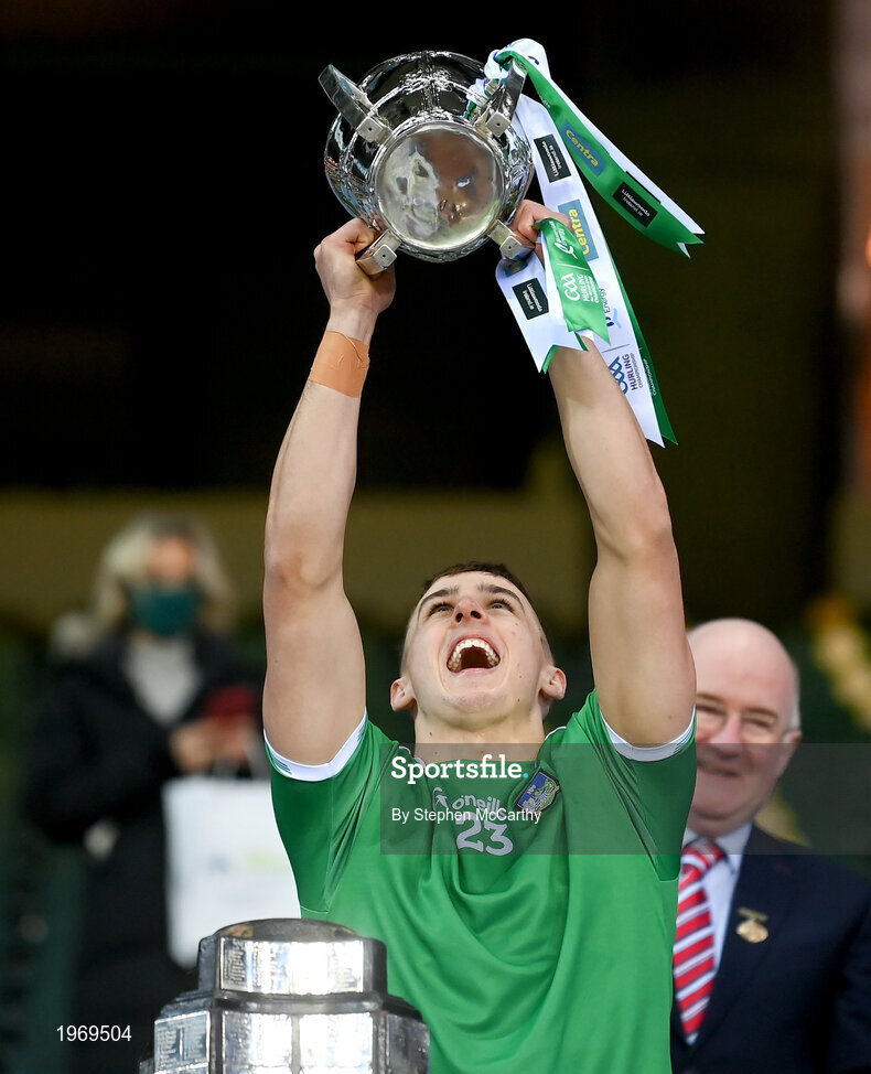 13 December 2020; Seán Finn of Limerick lifts the Liam MacCarthy Cup following the GAA Hurling All-Ireland Senior Championship Final match between Limerick and Waterford at Croke Park in Dublin. Photo by Stephen McCarthy/Sportsfile