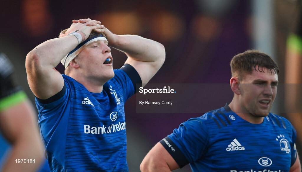 12 December 2020; Sean O'Brien, left, and Marcus Hanan of Leinster A during the A Interprovincial Friendly match between Leinster A and Connacht Eagles at Energia Park in Dublin. Photo by Ramsey Cardy/Sportsfile