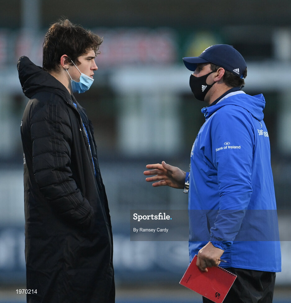 12 December 2020; Leinster A Elite player development officer Denis Leamy, right, in conversation with Alex Soroka of Leinster A following the A Interprovincial Friendly match between Leinster A and Connacht Eagles at Energia Park in Dublin. Photo by Ramsey Cardy/Sportsfile