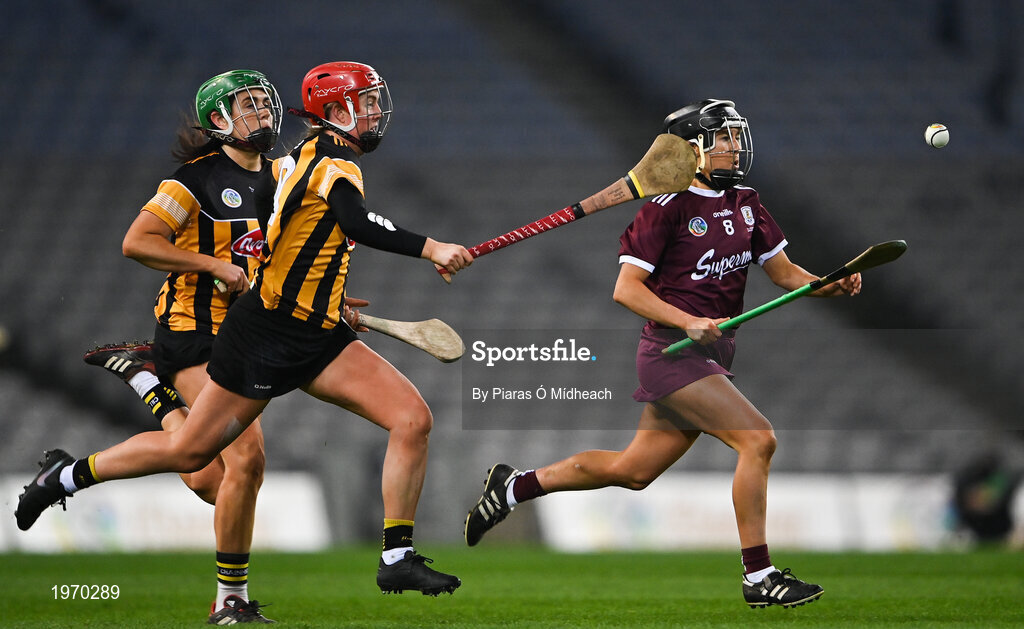 12 December 2020; Aoife Donohue of Galway gets past Miriam Walsh, left, and Kellyann Doyle of Kilkenny during the Liberty Insurance All-Ireland Senior Camogie Championship Final match between Galway and Kilkenny at Croke Park in Dublin. Photo by Piaras Ó Mídheach/Sportsfile