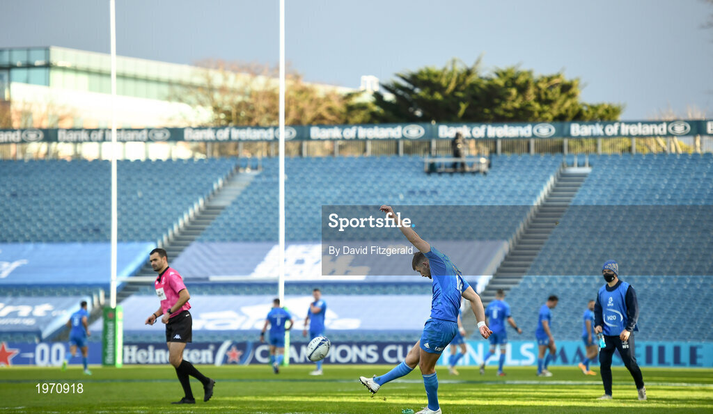 19 December 2020; Ross Byrne kicks a conversion during the Heineken Champions Cup Pool A Round 2 match between Leinster and Northampton Saints at the RDS Arena in Dublin. Photo by David Fitzgerald/Sportsfile