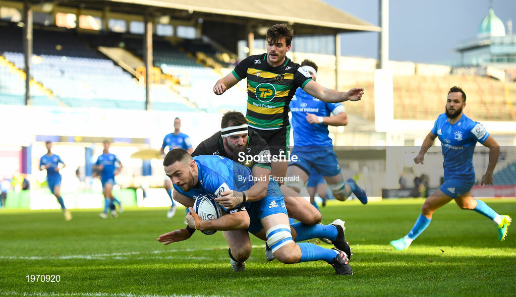 19 December 2020; Josh Murphy of Leinster scores his side's first try despite the attempted tackle from Tom Wood of Northampton Saints the Heineken Champions Cup Pool A Round 2 match between Leinster and Northampton Saints at the RDS Arena in Dublin. Photo by David Fitzgerald/Sportsfile