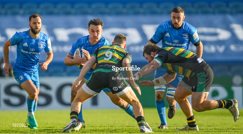 19 December 2020; Rónan Kelleher of Leinster in action against Tom James of Northampton Saints during the Heineken Champions Cup Pool A Round 2 match between Leinster and Northampton Saints at the RDS Arena in Dublin. Photo by Ramsey Cardy/Sportsfile
