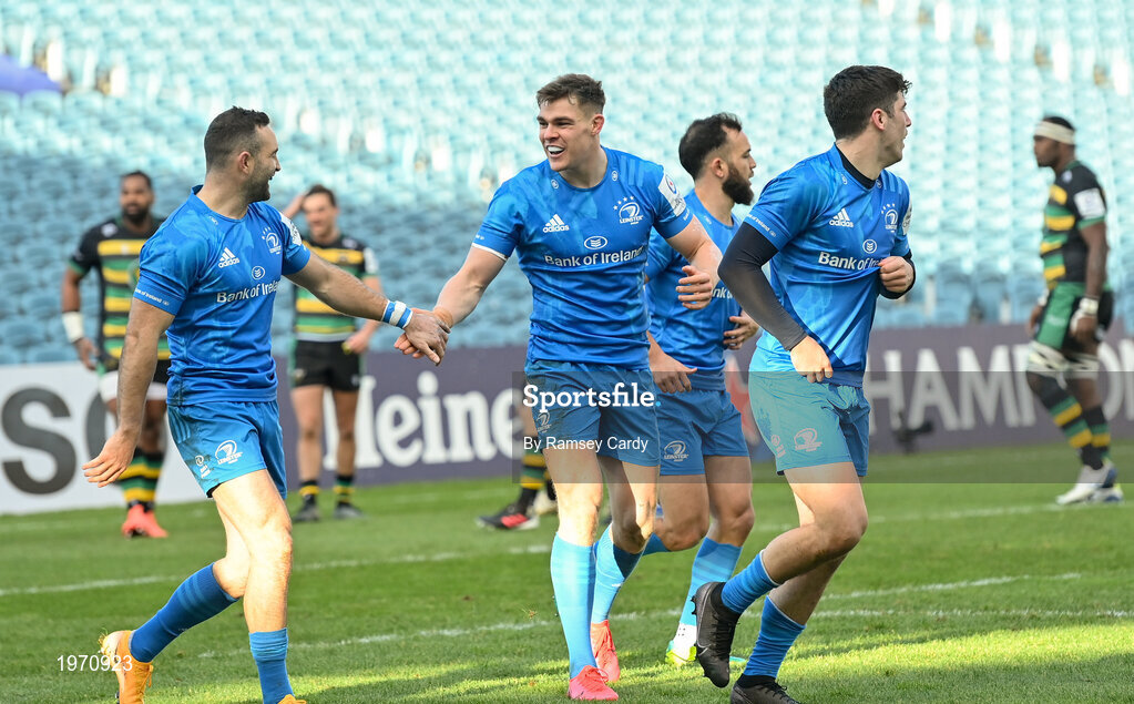 19 December 2020; Dave Kearney, left, and Garry Ringrose of Leinster celebrate their side's first try during the Heineken Champions Cup Pool A Round 2 match between Leinster and Northampton Saints at the RDS Arena in Dublin. Photo by Ramsey Cardy/Sportsfile