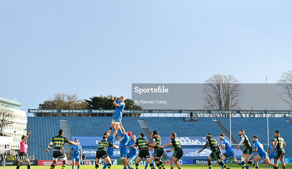 19 December 2020; Rhys Ruddock of Leinster wins possession in the lineout during the Heineken Champions Cup Pool A Round 2 match between Leinster and Northampton Saints at the RDS Arena in Dublin. Photo by Ramsey Cardy/Sportsfile