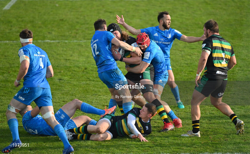 19 December 2020; Alex Moon of Northampton Saints is tackled by Robbie Henshaw, left, and Josh van der Flier of Leinster during the Heineken Champions Cup Pool A Round 2 match between Leinster and Northampton Saints at the RDS Arena in Dublin. Photo by Ramsey Cardy/Sportsfile