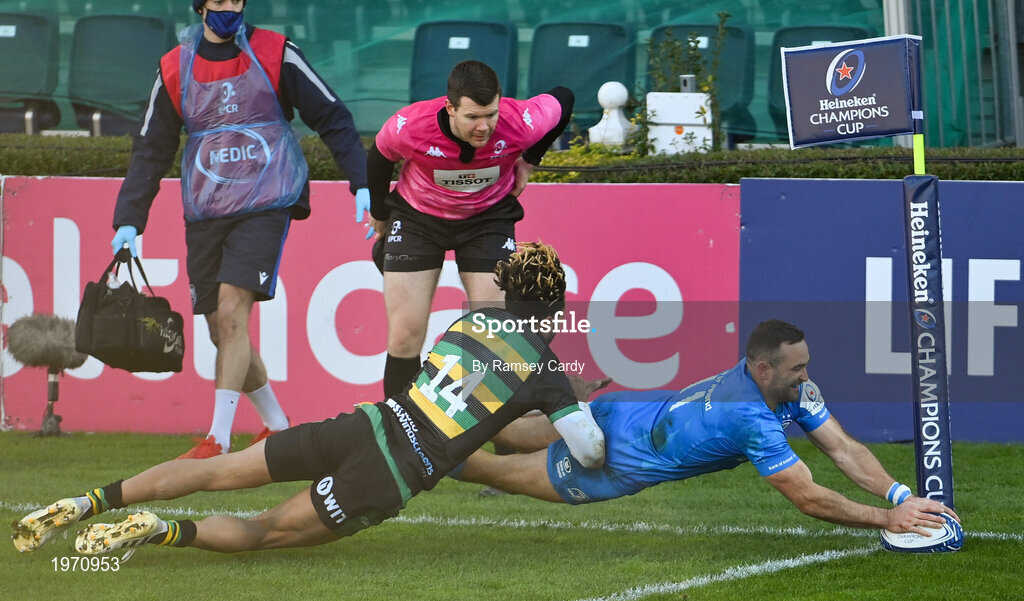 19 December 2020; Dave Kearney of Leinster scores his side's third try despite the tackle of Fraser Dingwall of Northampton Saints during the Heineken Champions Cup Pool A Round 2 match between Leinster and Northampton Saints at the RDS Arena in Dublin. Photo by Ramsey Cardy/Sportsfile