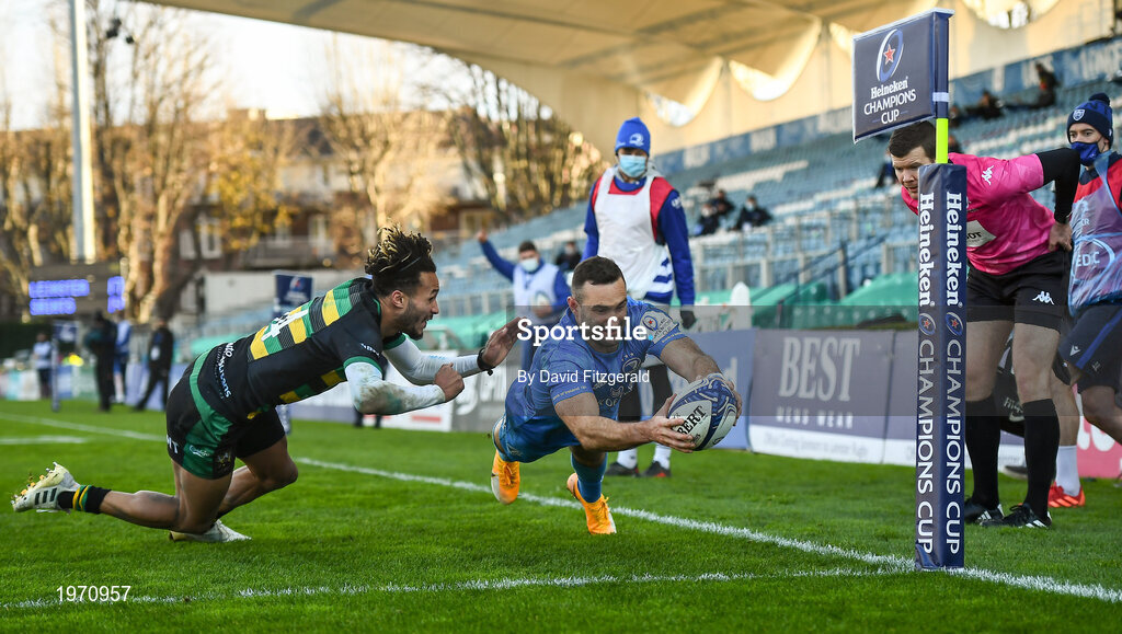 19 December 2020; Dave Kearney of Leinster scores his side's third try despite the attempted tackle from Ryan Olowofela of Northampton Saints during the Heineken Champions Cup Pool A Round 2 match between Leinster and Northampton Saints at the RDS Arena in Dublin. Photo by David Fitzgerald/Sportsfile