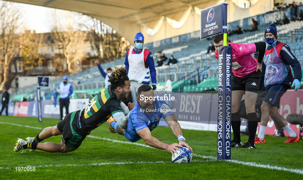 19 December 2020; Dave Kearney of Leinster scores his side's third try despite the attempted tackle from Ryan Olowofela of Northampton Saints during the Heineken Champions Cup Pool A Round 2 match between Leinster and Northampton Saints at the RDS Arena in Dublin. Photo by David Fitzgerald/Sportsfile