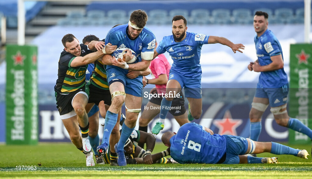 19 December 2020; Ryan Baird of Leinster is tackled by Tom Collins of Northampton Saints during the Heineken Champions Cup Pool A Round 2 match between Leinster and Northampton Saints at the RDS Arena in Dublin. Photo by David Fitzgerald/Sportsfile