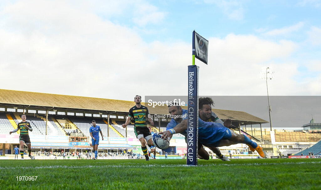 19 December 2020; Dave Kearney of Leinster scores his side's third try despite the attempted tackle from Ryan Olowofela of Northampton Saints during the Heineken Champions Cup Pool A Round 2 match between Leinster and Northampton Saints at the RDS Arena in Dublin. Photo by David Fitzgerald/Sportsfile