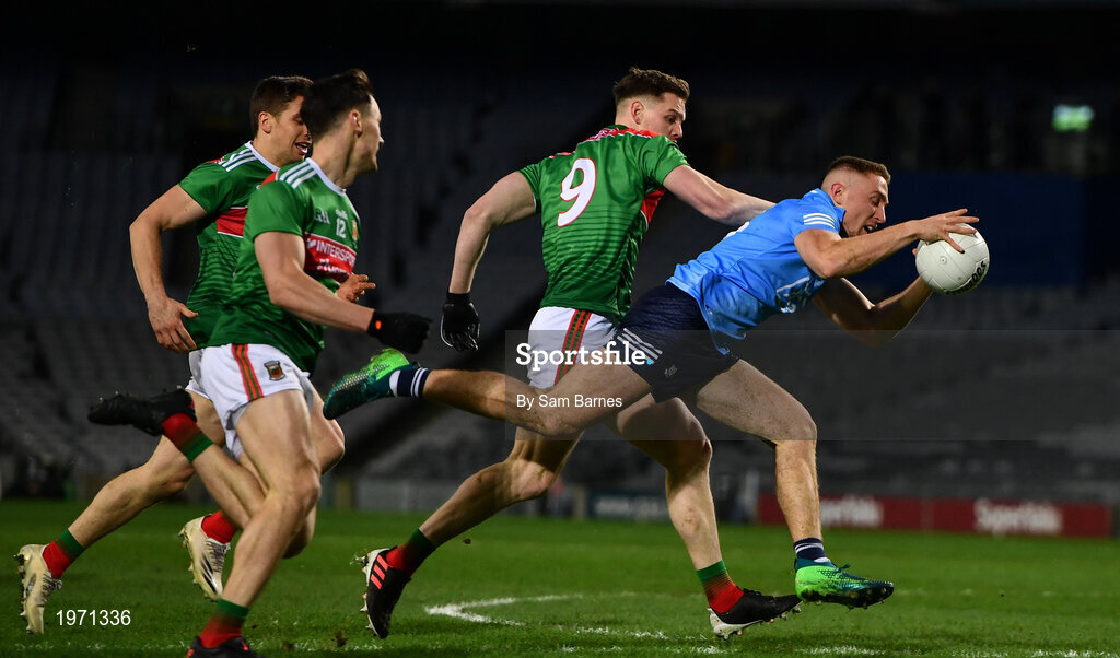 19 December 2020; Paddy Small of Dublin is tackled by Matthew Ruane of Mayo during the GAA Football All-Ireland Senior Championship Final match between Dublin and Mayo at Croke Park in Dublin. Photo by Sam Barnes/Sportsfile