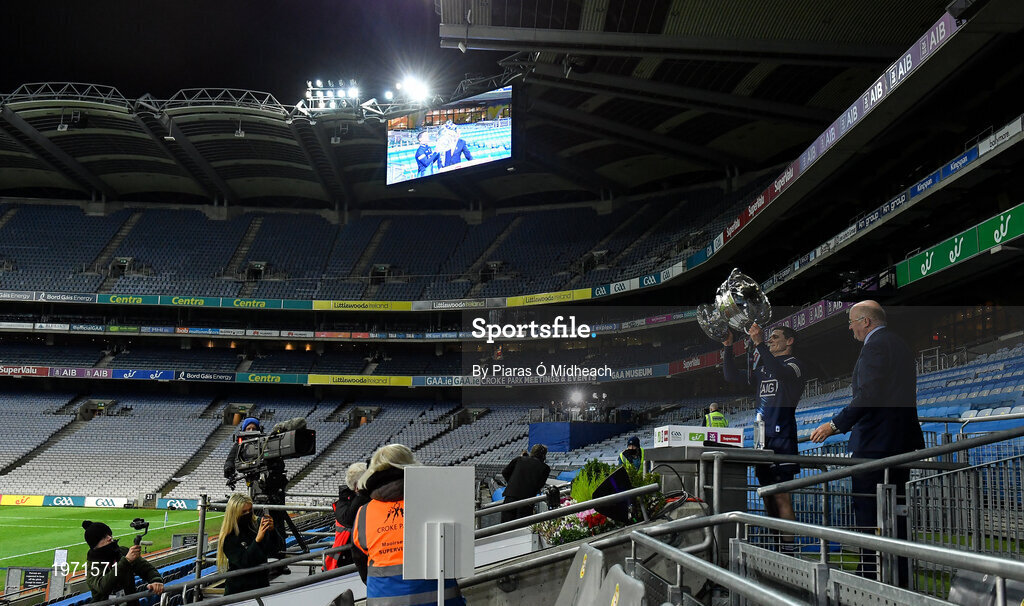 19 December 2020; Dublin captain Stephen Cluxton lifts the Sam Maguire Cup following the GAA Football All-Ireland Senior Championship Final match between Dublin and Mayo at Croke Park in Dublin. Photo by Piaras Ó Mídheach/Sportsfile