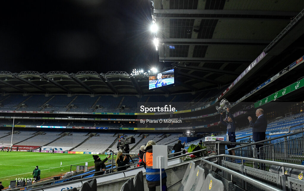 19 December 2020; Dublin captain Stephen Cluxton lifts the Sam Maguire Cup following the GAA Football All-Ireland Senior Championship Final match between Dublin and Mayo at Croke Park in Dublin. Photo by Piaras Ó Mídheach/Sportsfile