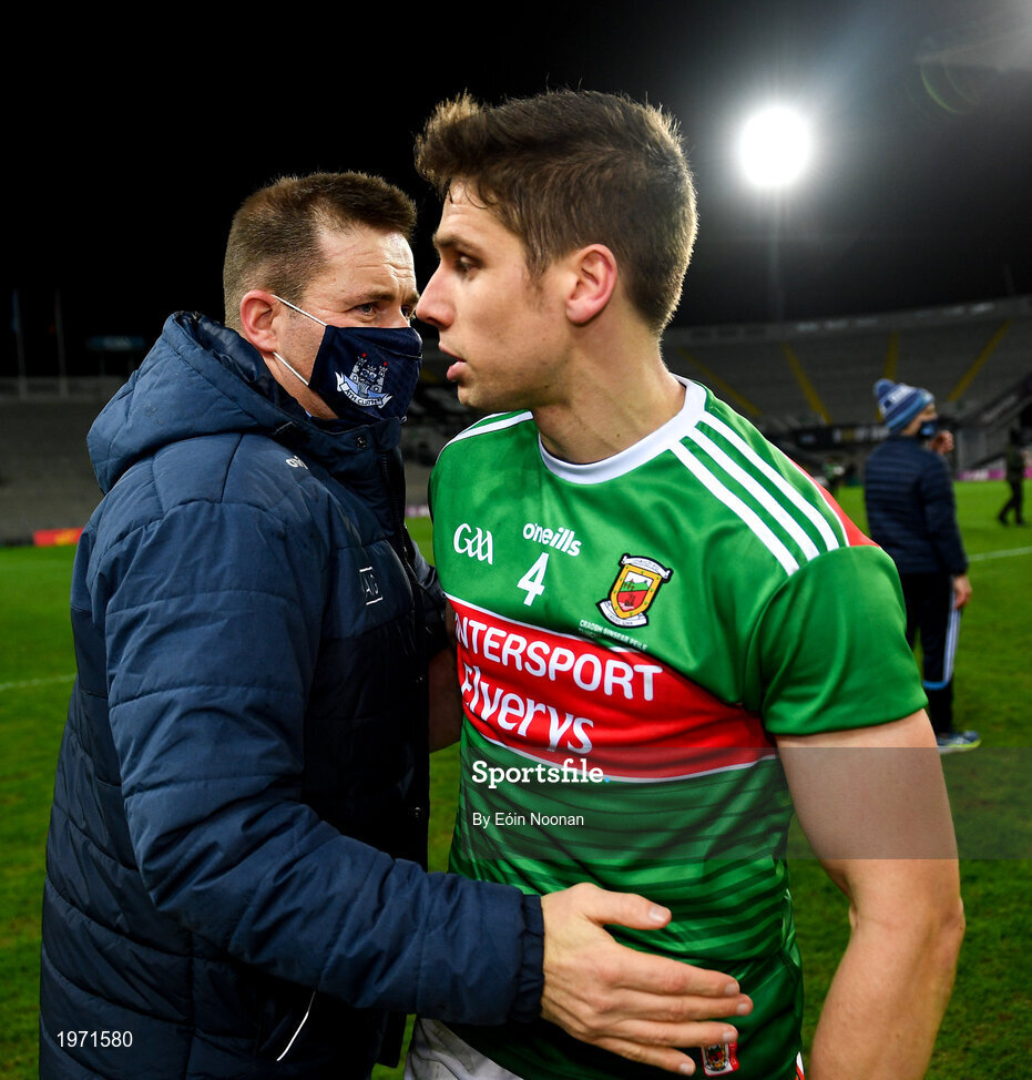 19 December 2020; Dublin manager Dessie Farrell and Lee Keegan of Mayo following the GAA Football All-Ireland Senior Championship Final match between Dublin and Mayo at Croke Park in Dublin. Photo by Eóin Noonan/Sportsfile