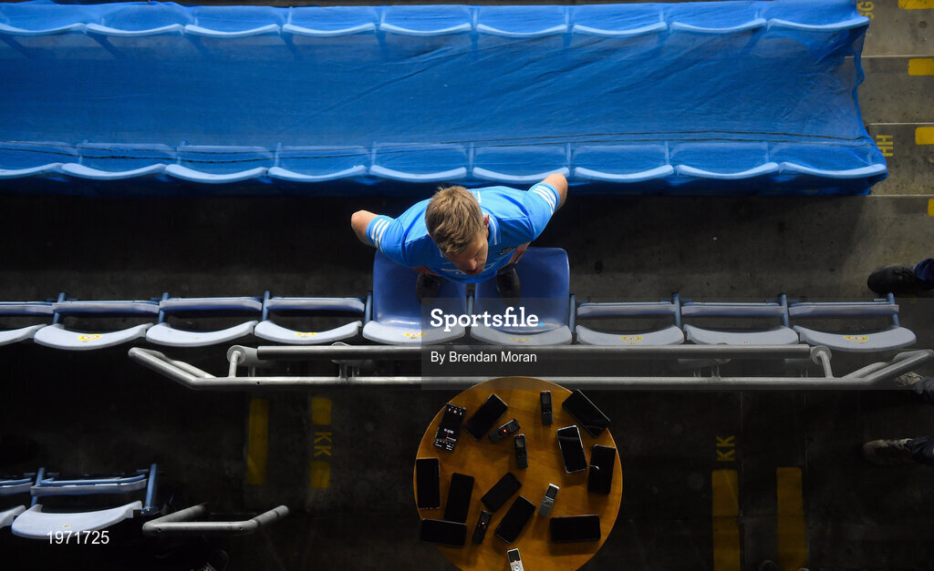 19 December 2020; Jonny Cooper of Dublin are interviewed by the media in the empty seats of the Hogan Stand after the GAA Football All-Ireland Senior Championship Final match between Dublin and Mayo at Croke Park in Dublin. Photo by Brendan Moran/Sportsfile
