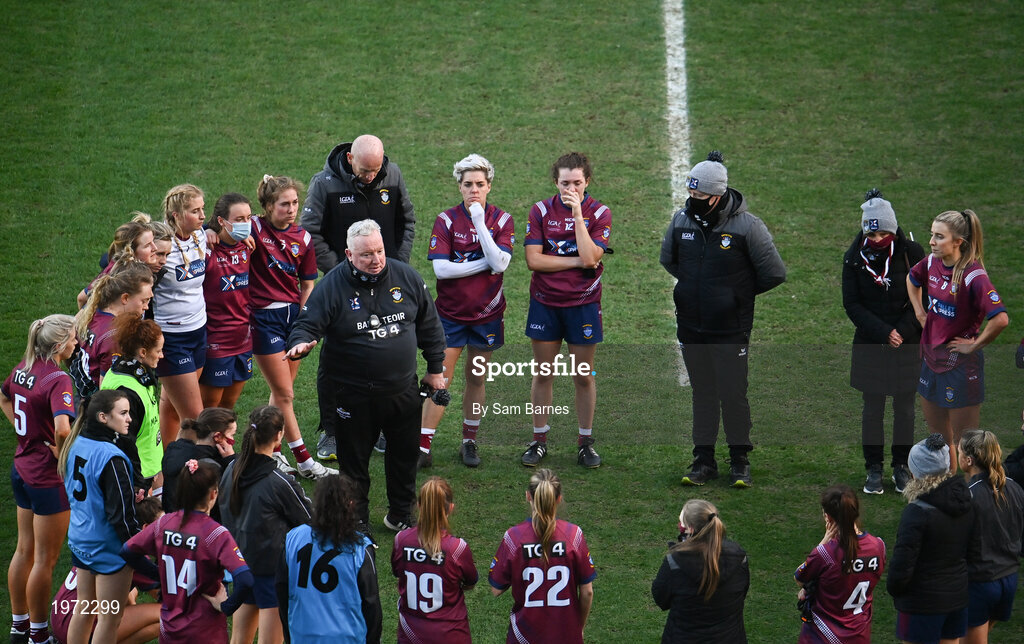 20 December 2020; Westmeath manager Sean Finnegan speaks to his team following the TG4 All-Ireland Intermediate Ladies Football Championship Final match between Meath and Westmeath at Croke Park in Dublin. Photo by Sam Barnes/Sportsfile