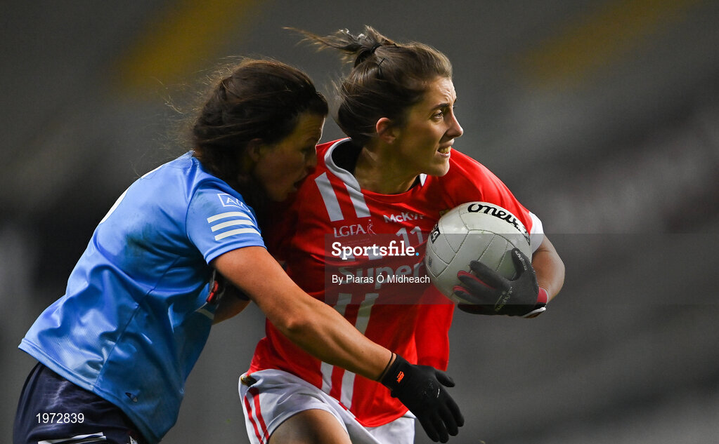 20 December 2020; Ciara O'Sullivan of Cork is tackled by Leah Caffrey of Dublin during the TG4 All-Ireland Senior Ladies Football Championship Final match between Cork and Dublin at Croke Park in Dublin. Photo by Piaras Ó Mídheach/Sportsfile