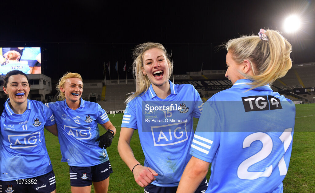 20 December 2020; Nicole Owens of Dublin, 15, celebrates with team-mates from left, Lyndsey Davey, Carla Rowe, and Caoimhe O'Connor after the TG4 All-Ireland Senior Ladies Football Championship Final match between Cork and Dublin at Croke Park in Dublin. Photo by Piaras Ó Mídheach/Sportsfile