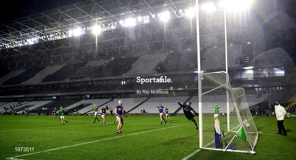 1 November 2020; Tipperary goalkeeper Brian Hogan is beaten by Seamus Flanagan's last minute shot for a Limerick goal during the Munster GAA Hurling Senior Championship Semi-Final match between Tipperary and Limerick at Páirc Uí Chaoimh in Cork. Due to ongoing restrictions imposed by the Irish Government to contain the spread of the Coronavirus (Covid-19) pandemic, elite sport is still permitted to take place behind closed doors. Photo by Ray McManus/Sportsfile