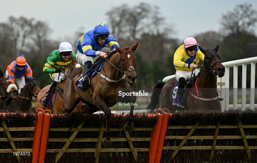 26 December 2020; Dysart Diamond, left, with David Mullins up, jumps the last on their way to winning the Holden Plant Rentals Novice Handicap Hurdle on day one of the Leopardstown Christmas Festival at Leopardstown Racecourse in Dublin. Photo by Seb Daly/Sportsfile
