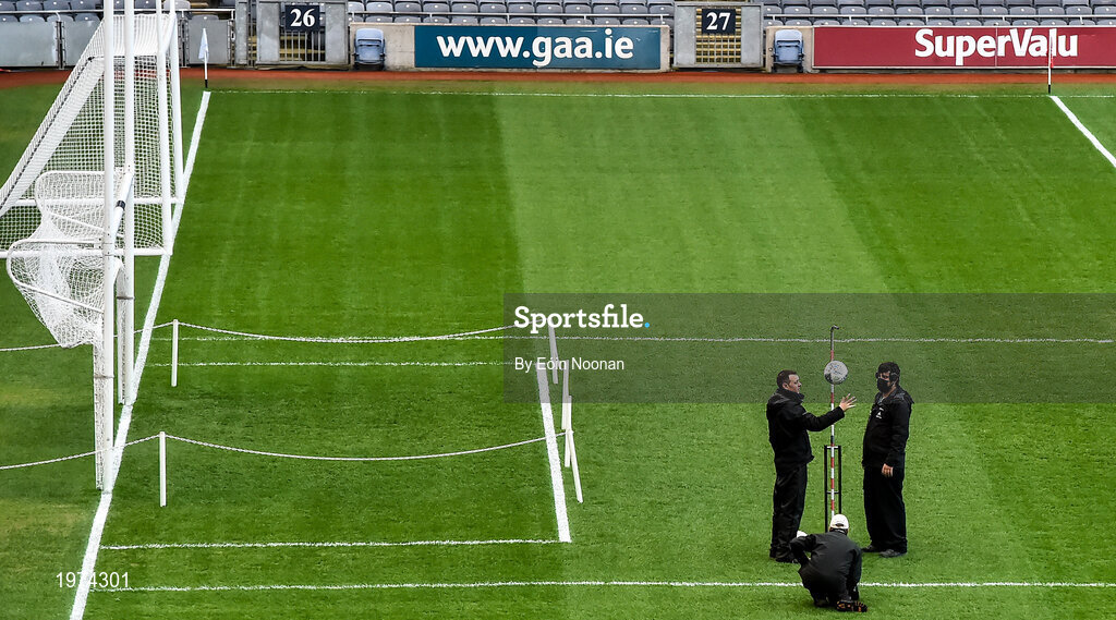 1 September 2019; Groundsmen test the pitch prior to the GAA Football All-Ireland Senior Championship Final match between Dublin and Kerry at Croke Park in Dublin. Photo by Eóin Noonan/Sportsfile