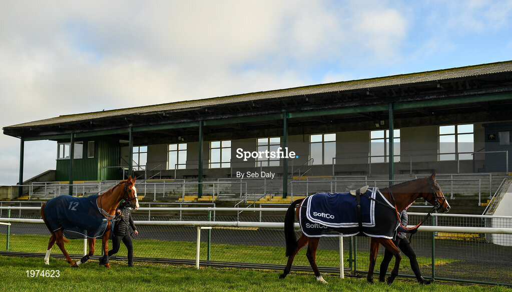 1 January 2021; Garm Colombe, right, and Tipperary Dexter are led to the pre-parade ring in front of the empty grandstand prior to the David Flynn Construction Maiden Hurdle at Tramore Racecourse in Waterford. Photo by Seb Daly/Sportsfile