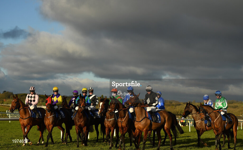 1 January 2021; Jockeys and their mounts prior to the start of the Tramore Medical Clinic Handicap Hurdle at Tramore Racecourse in Waterford. Photo by Seb Daly/Sportsfile