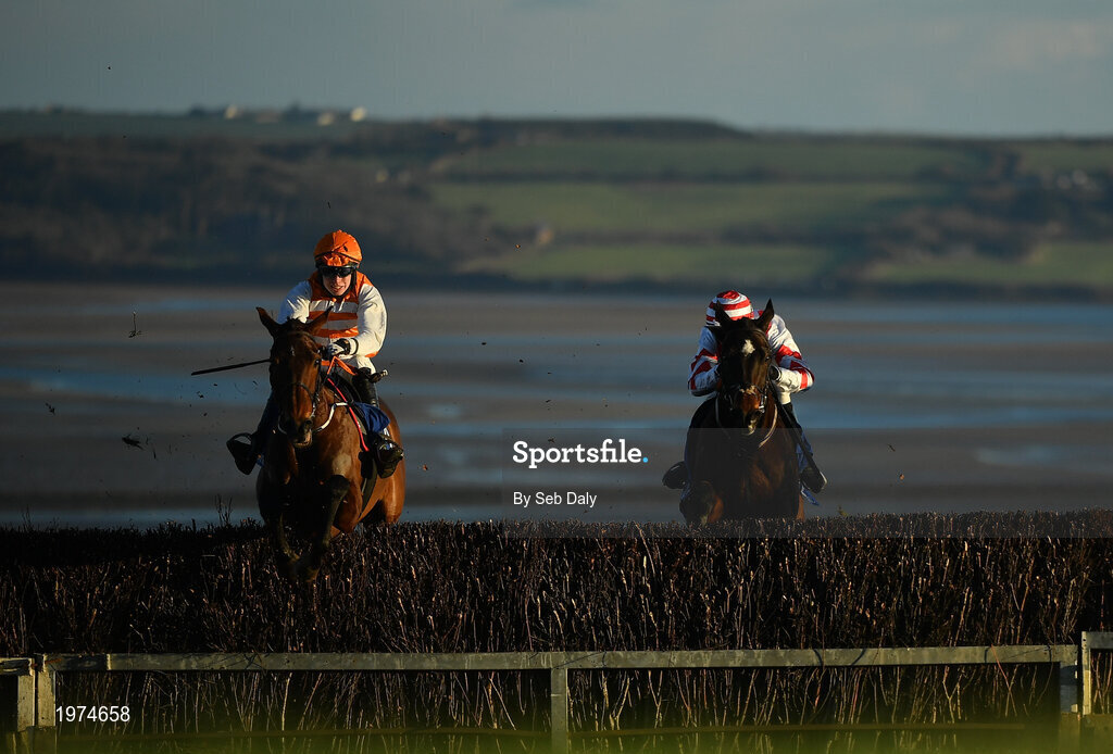 1 January 2021; Cash Me Outside, left, with Richard Condon up, jumps the fourth alongside Brex Drago, with Jonathan Moore up, during the VS Direct No Limits Marketing Rated Novice Steeplechase at Tramore Racecourse in Waterford. Photo by Seb Daly/Sportsfile