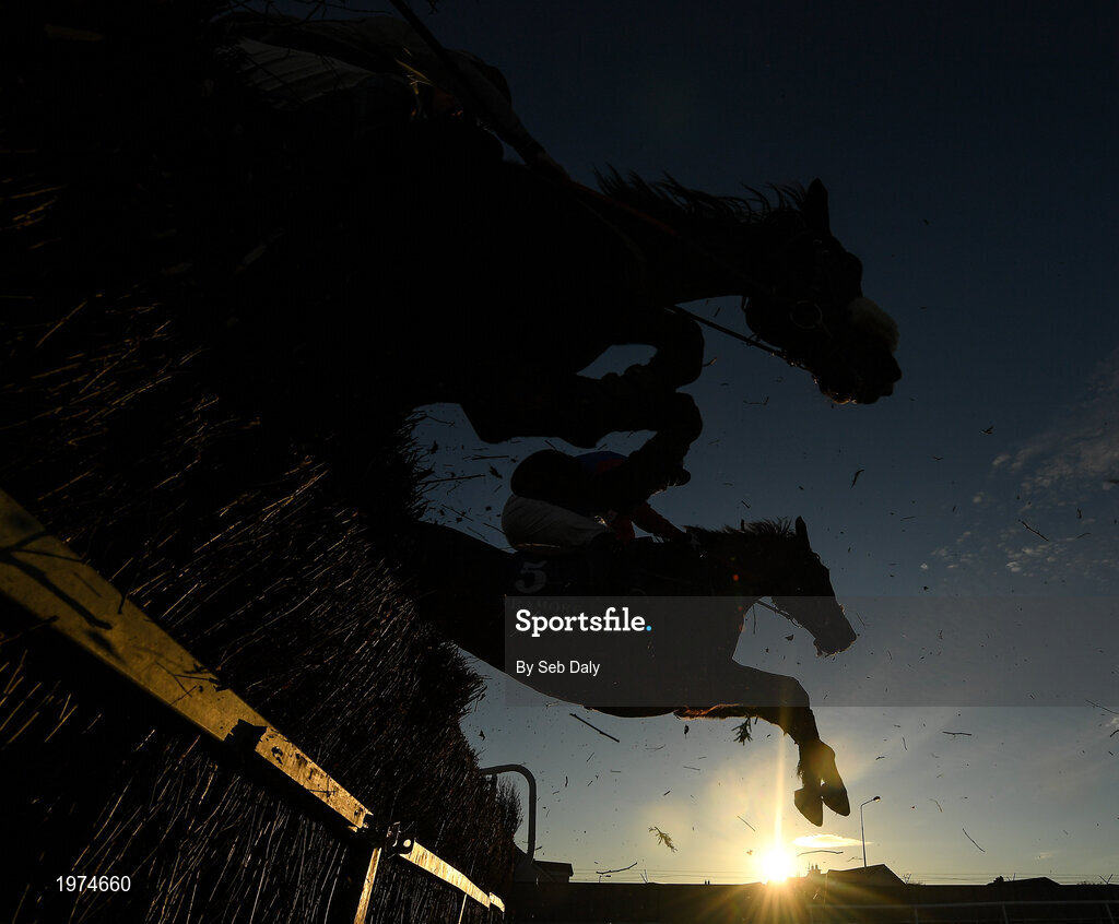 1 January 2021; Ballea Fox, near, with Barry John Foley up, jumps the fourth alongside Downthecellar, with Philip Donovan up, during the VS Direct No Limits Marketing Rated Novice Steeplechase at Tramore Racecourse in Waterford. Photo by Seb Daly/Sportsfile