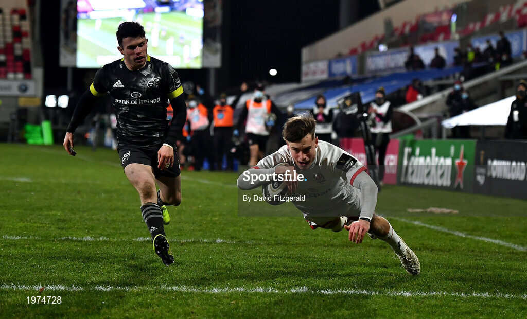 2 January 2021; Ethan McIlroy of Ulster scores his side's second try during the Guinness PRO14 match between Ulster and Munster at Kingspan Stadium in Belfast. Photo by David Fitzgerald/Sportsfile
