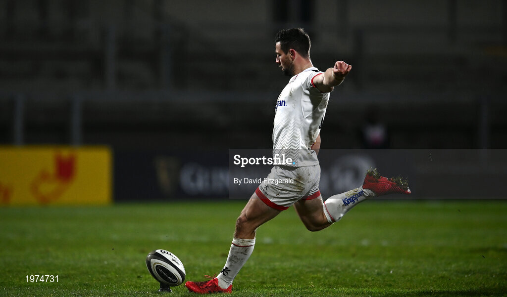 2 January 2021; John Cooney of Ulster kicks a penalty during the Guinness PRO14 match between Ulster and Munster at Kingspan Stadium in Belfast. Photo by David Fitzgerald/Sportsfile