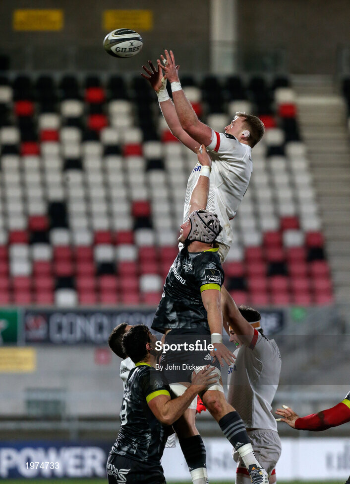 2 January 2021; Kieran Traedwell of Ulster wins the ball in the lineout during the Guinness PRO14 match between Ulster and Munster at Kingspan Stadium in Belfast. Photo by John Dickson/Sportsfile