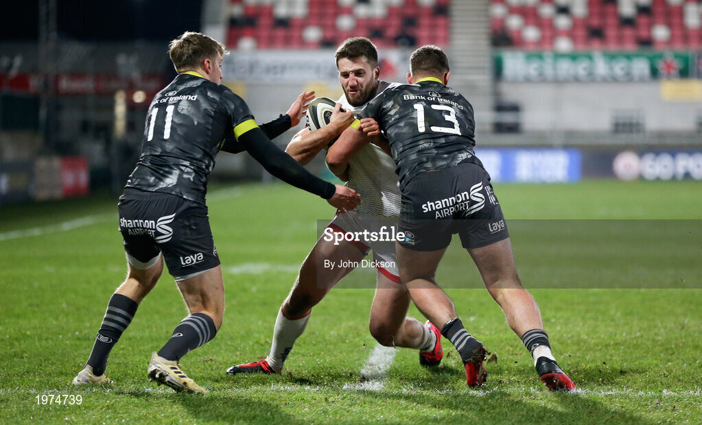 2 January 2021; Stuart McCloskey of Ulster is tackled by Liam Coombes and Dan Goggin of Munster during the Guinness PRO14 match between Ulster and Munster at Kingspan Stadium in Belfast. Photo by John Dickson/Sportsfile
