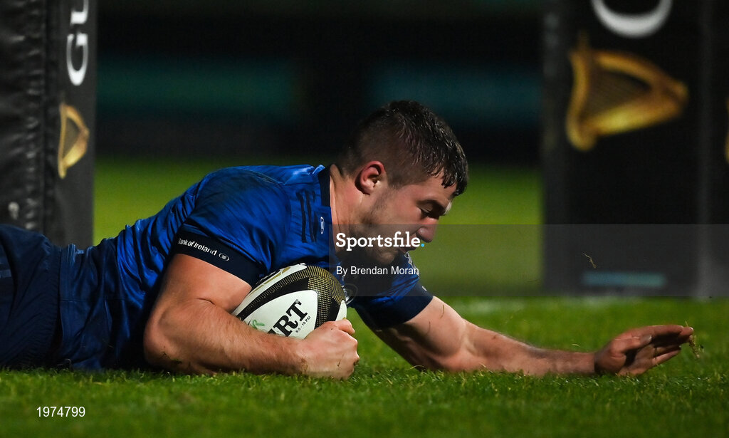 2 January 2021; Scott Penny of Leinster scores his side's first try during the Guinness PRO14 match between Leinster and Connacht at the RDS Arena in Dublin. Photo by Brendan Moran/Sportsfile