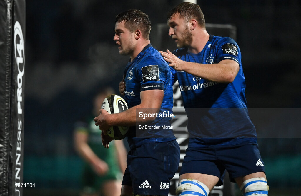 2 January 2021; Scott Penny of Leinster celebrates with team-mate Ross Molony after scoring their side's first try during the Guinness PRO14 match between Leinster and Connacht at the RDS Arena in Dublin. Photo by Brendan Moran/Sportsfile