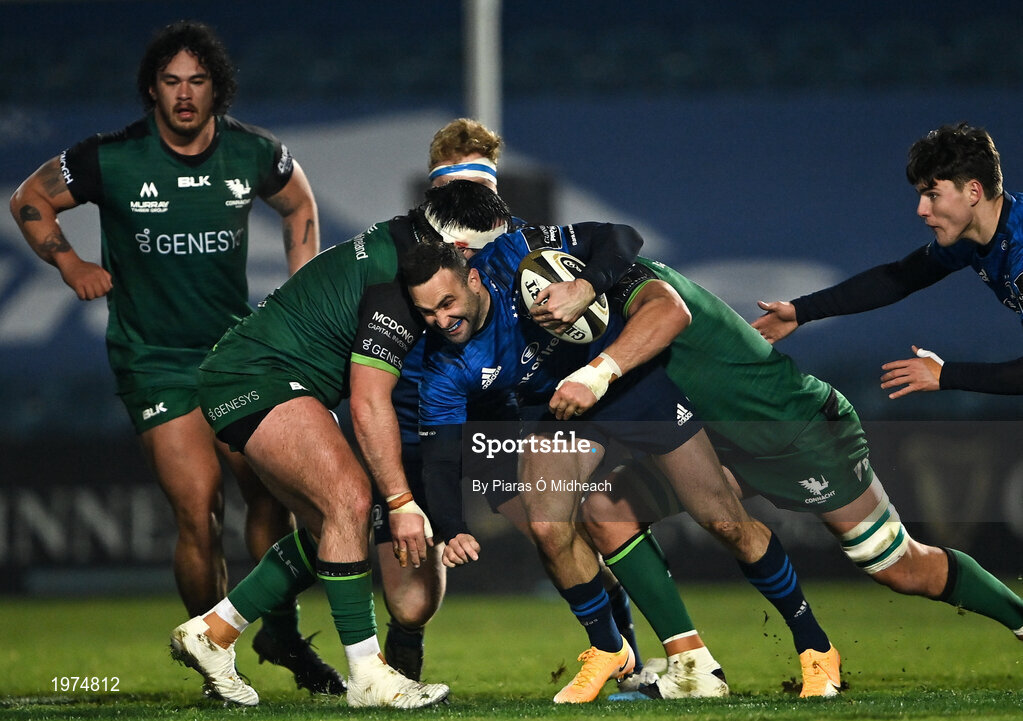 2 January 2021; Dave Kearney of Leinster is tackled by Denis Buckley, left, and Quinn Roux of Connacht during the Guinness PRO14 match between Leinster and Connacht at the RDS Arena in Dublin. Photo by Piaras Ó Mídheach/Sportsfile