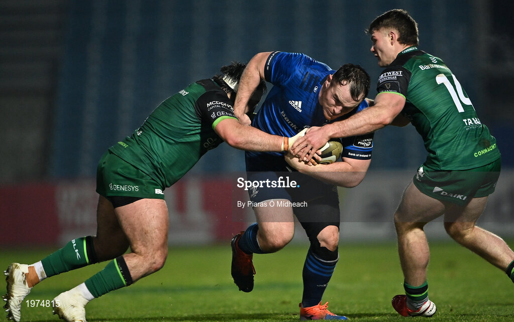 2 January 2021; Peter Dooley of Leinster is tackled by Denis Buckley, left, and Peter Sullivan of Connacht during the Guinness PRO14 match between Leinster and Connacht at the RDS Arena in Dublin. Photo by Piaras Ó Mídheach/Sportsfile