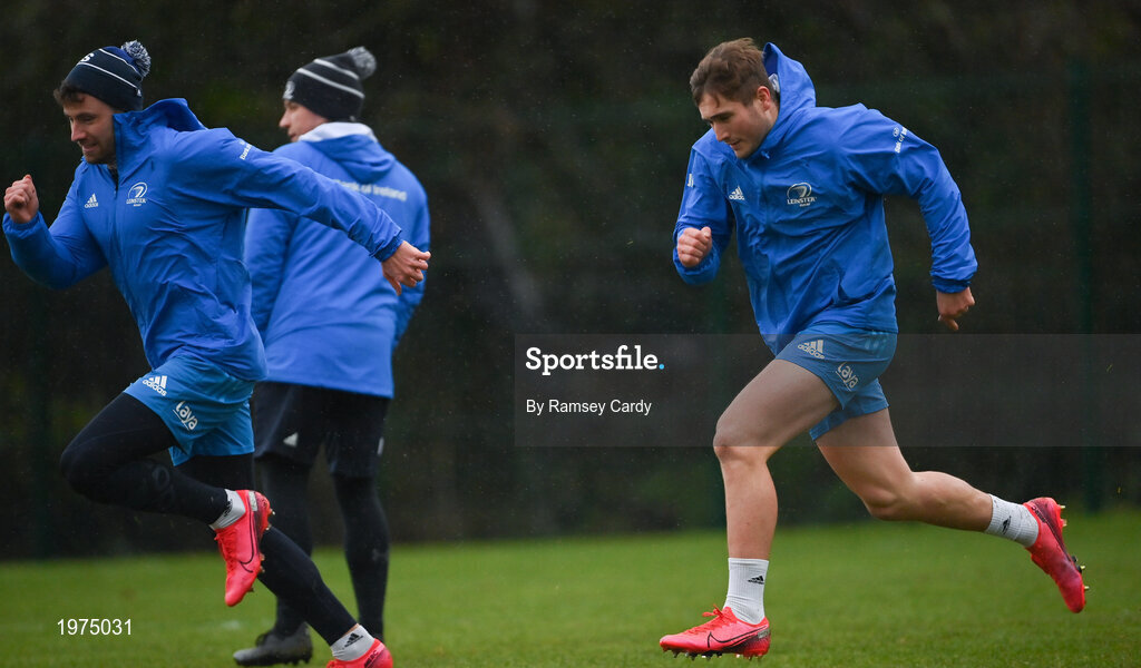 4 January 2021; Hugo Keenan, left, and Jordan Larmour during Leinster Rugby squad training at UCD in Dublin. Photo by Ramsey Cardy/Sportsfile