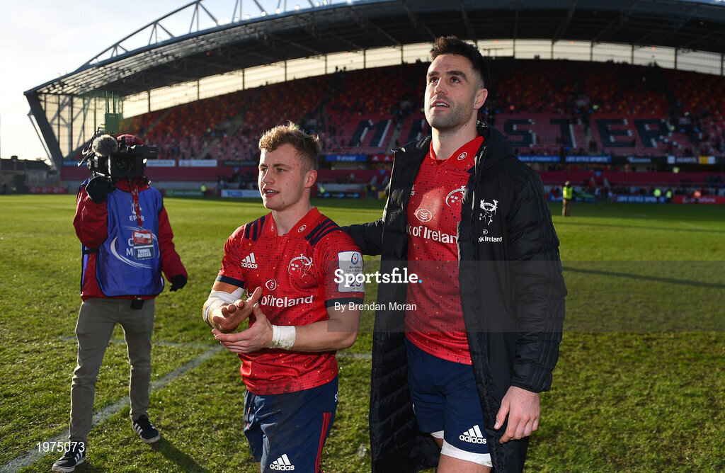 19 January 2020; Craig Casey, left, and Conor Murray of Munster after the Heineken Champions Cup Pool 4 Round 6 match between Munster and Ospreys at Thomond Park in Limerick. Photo by Brendan Moran/Sportsfile