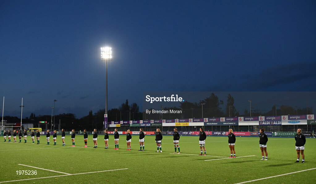 24 October 2020; The Ireland team stand for the national anthems prior to the Women's Six Nations Rugby Championship match between Ireland and Italy at Energia Park in Dublin. Due to current restrictions laid down by the Irish government to prevent the spread of coronavirus and to adhere to social distancing regulations, all sports events in Ireland are currently held behind closed doors. Photo by Brendan Moran/Sportsfile