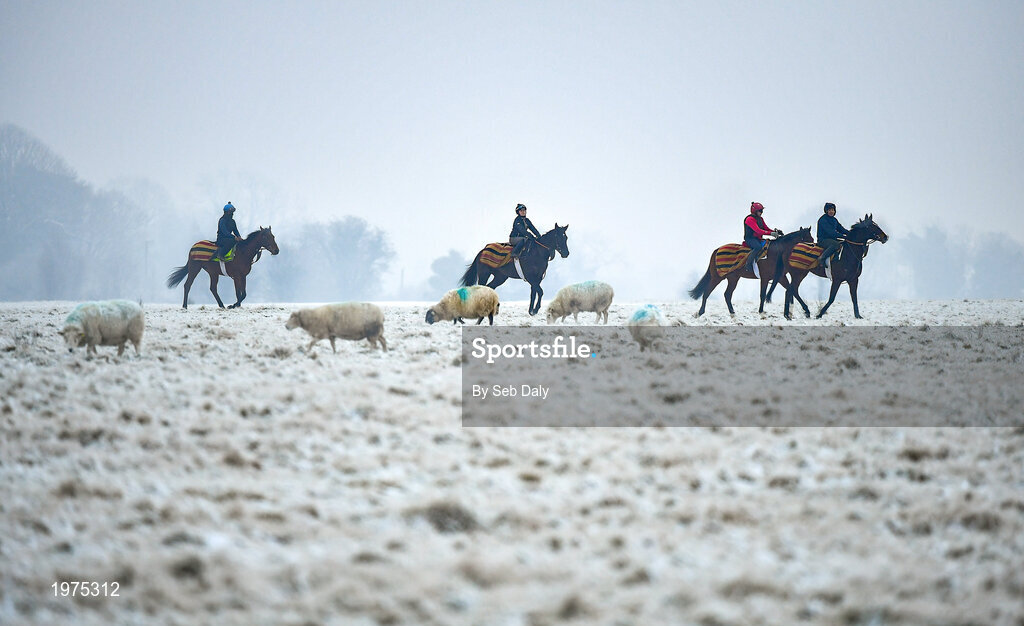 7 January 2021; A string of horses from the yard of racehorse trainer Willie McCreery make their way to the gallops at the Curragh, in Kildare. Photo by Seb Daly/Sportsfile