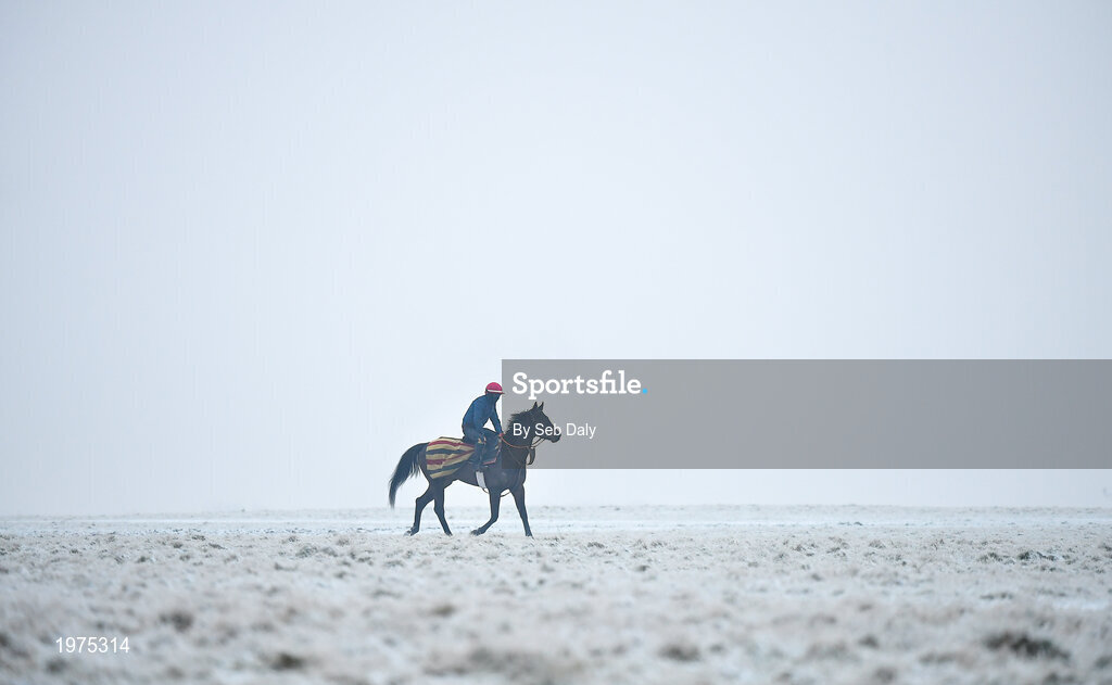 7 January 2021; A horse from the yard of racehorse trainer Willie McCreery makes its way to the gallops at the Curragh, in Kildare. Photo by Seb Daly/Sportsfile