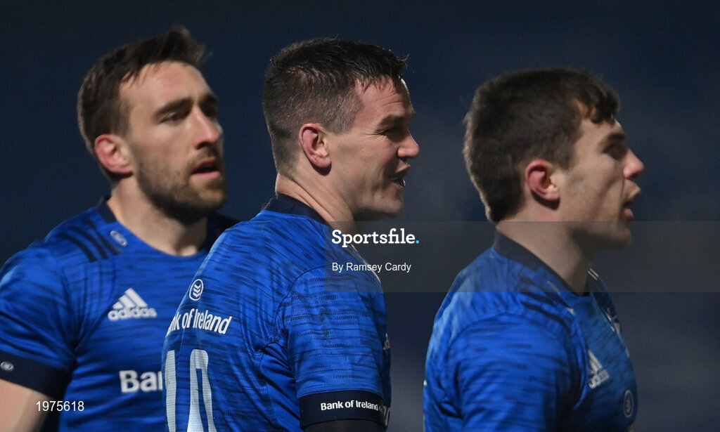 8 January 2021; Leinster players, from left, Jack Conan, Jonathan Sexton and Luke McGrath during the Guinness PRO14 match between Leinster and Ulster at the RDS Arena in Dublin. Photo by Ramsey Cardy/Sportsfile